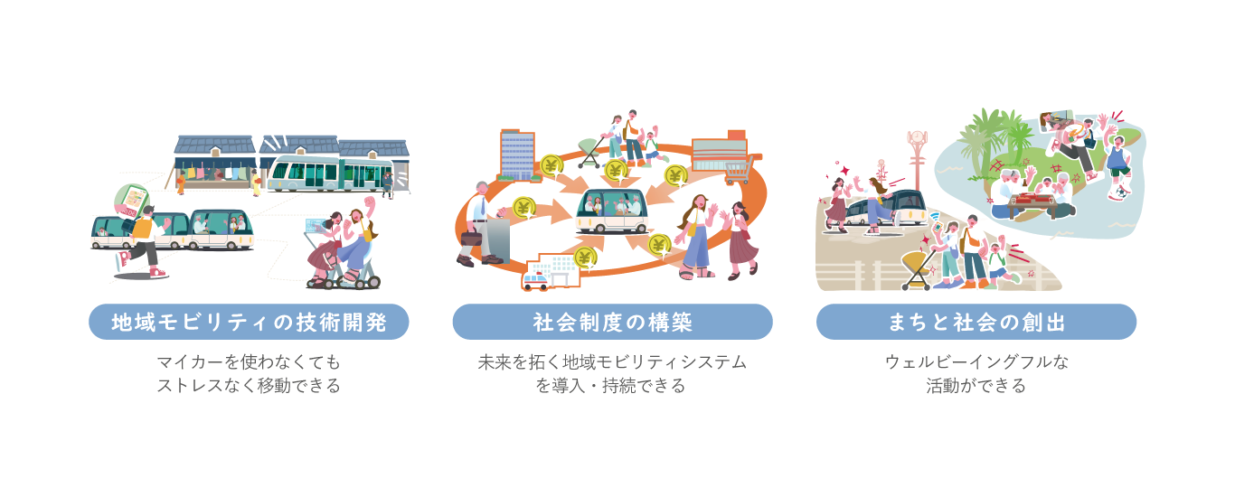 本拠点では、『みんなの「⾏きたい」「会いたい」「参加したい」をかなえる超移動社会』をビジョンに掲げ、このような地域において、マイカーを使わない(運転できない、運転したくない)⼈にも社会に公平なアクセスができるような超移動社会を⽬指します。