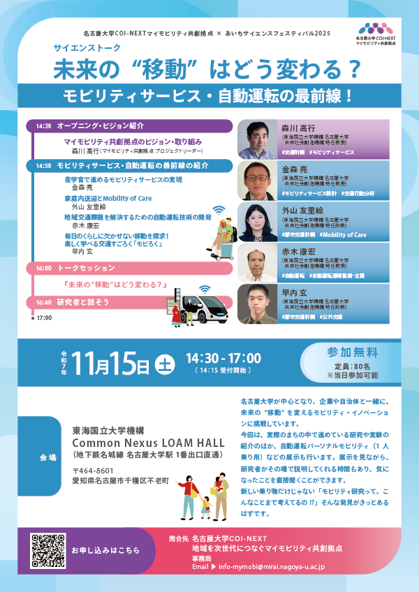 名古屋大学COI-NEXTマイモビリティ共創拠点は、令和7年11月15日(土)に開催される「あいちサイエンスフェスティバル2025@ComoNe」において、研究者によるトークイベント『サイエンストーク「未来の“移動”はどう変わる?~モビリティサービス・自動運転の最前線!~」』を実施します。