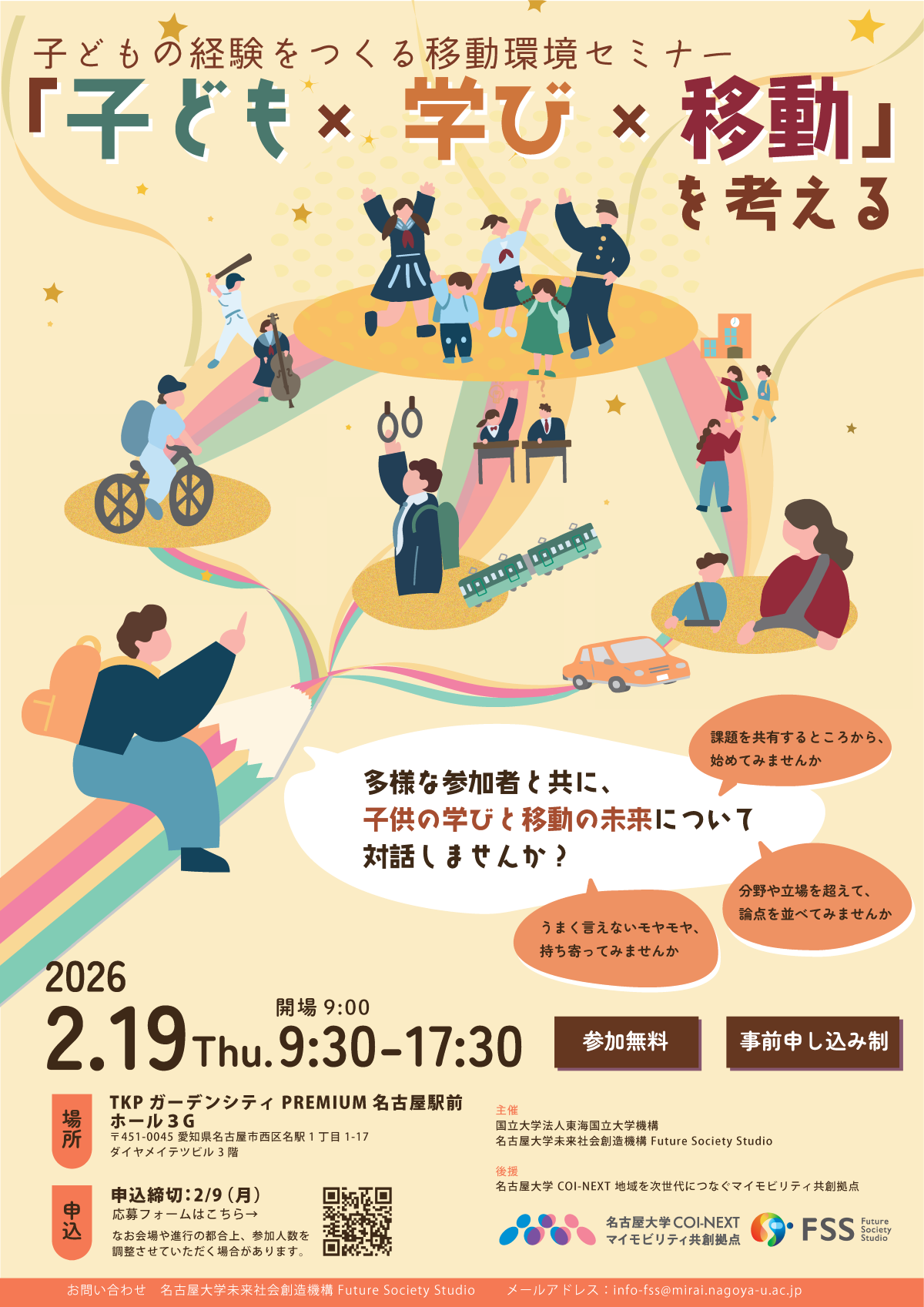 本セミナーでは「子ども×学び×移動」をキーワードに、教育・交通・地域支援に関わる多様な立場の方々が集い、移動環境が子どもの学びや体験にどのような影響をもたらしているのかについて、現場から見える構造的課題や、政策・地域における可能性を多角的に検討し、今後の連携と実践につながる視点を探ります。